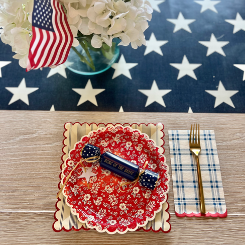I also purchased this table runner from My Mind's Eye. Their website has super cute table scape examples and I chose the plates they had already shown with this table runner. I threw some of my faux hydrangeas in vases on the table with small flags from Amazon and it was just enough.